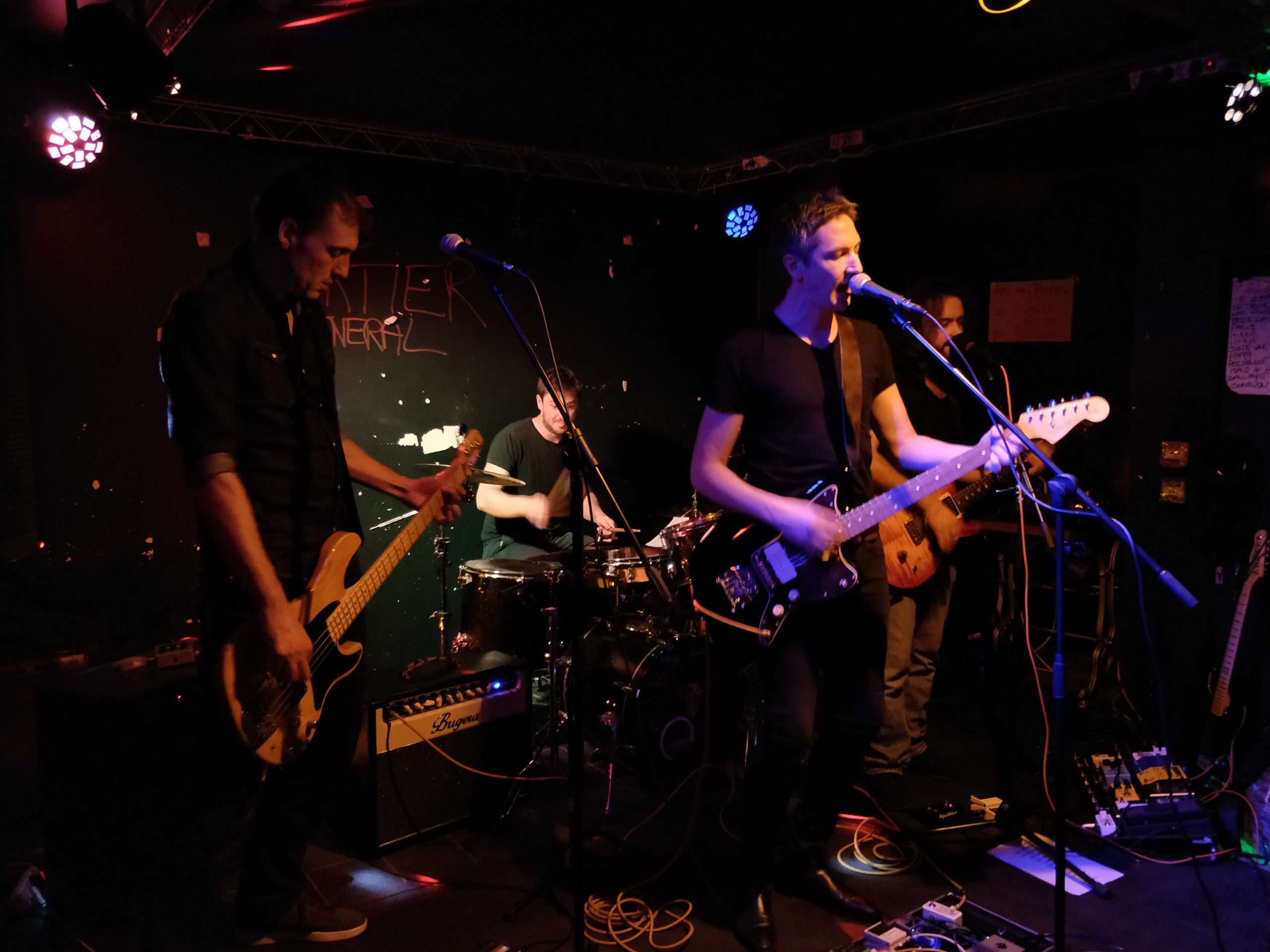 Début des balances vers 18h30, avec comme d’hab’ les petits coup de stress : une pièce du Charley qui s’est fait la malle, les câbles XLR trop courts, la table qui refuse d’envoyer du son dans les retours, et quelques regards interrogateurs du patron, Chris, qui finit par nous demander où sont nos amplis… C’est pas habituel de voir un groupe de rock sans leurs « lampes », mais depuis le Cavern, on s’est vite habitués à jouer en direct sur la table.